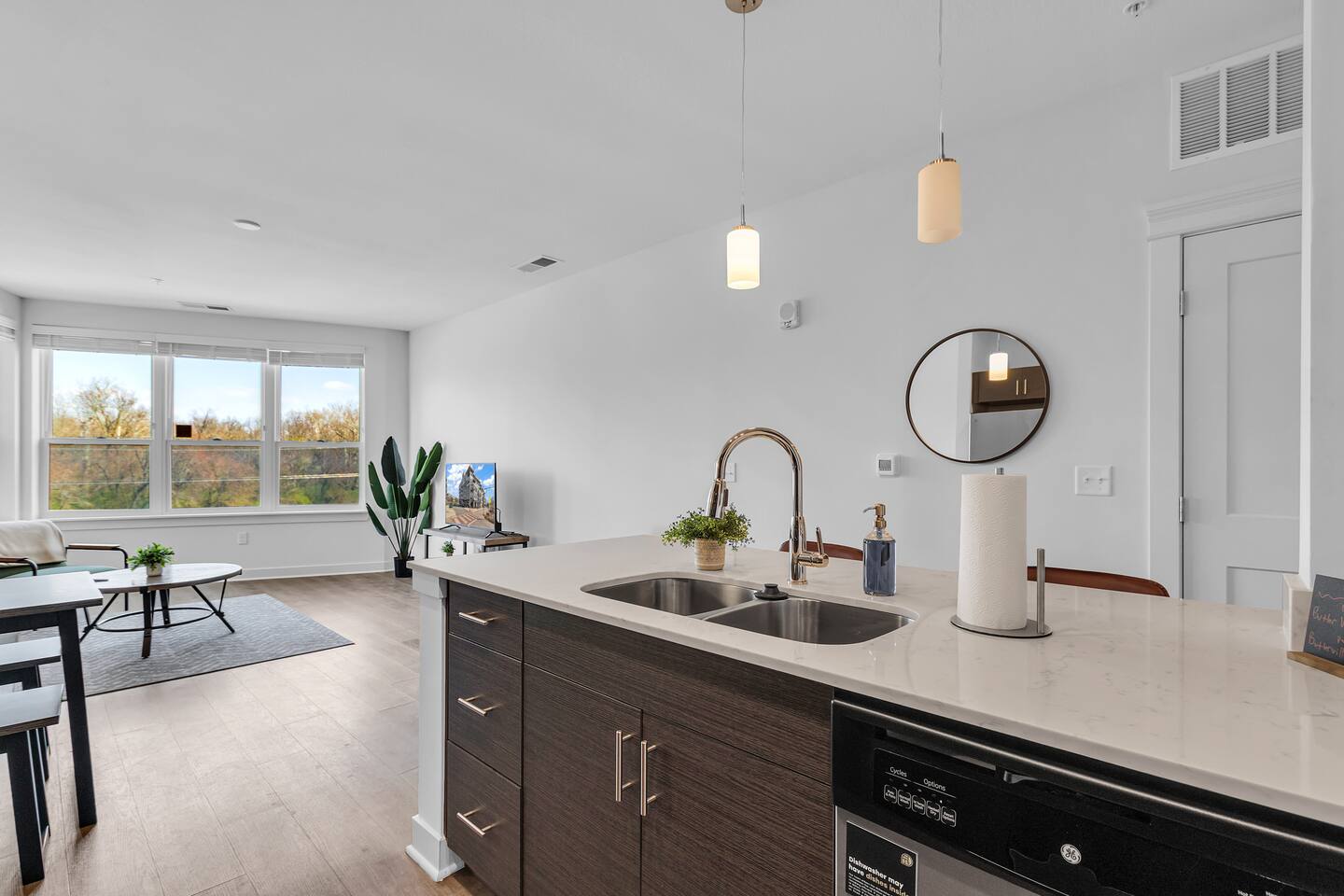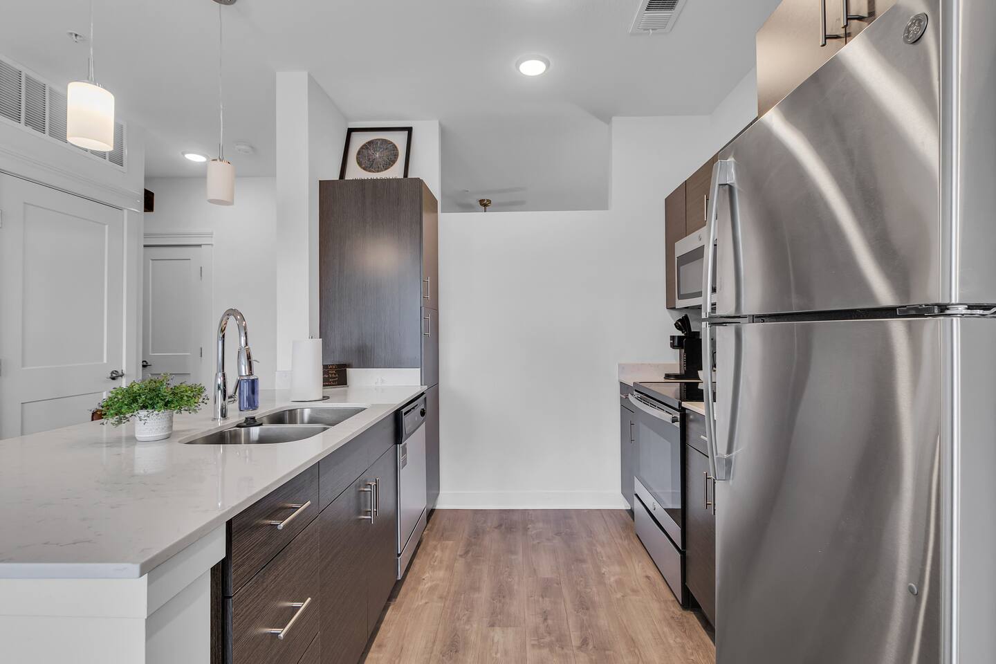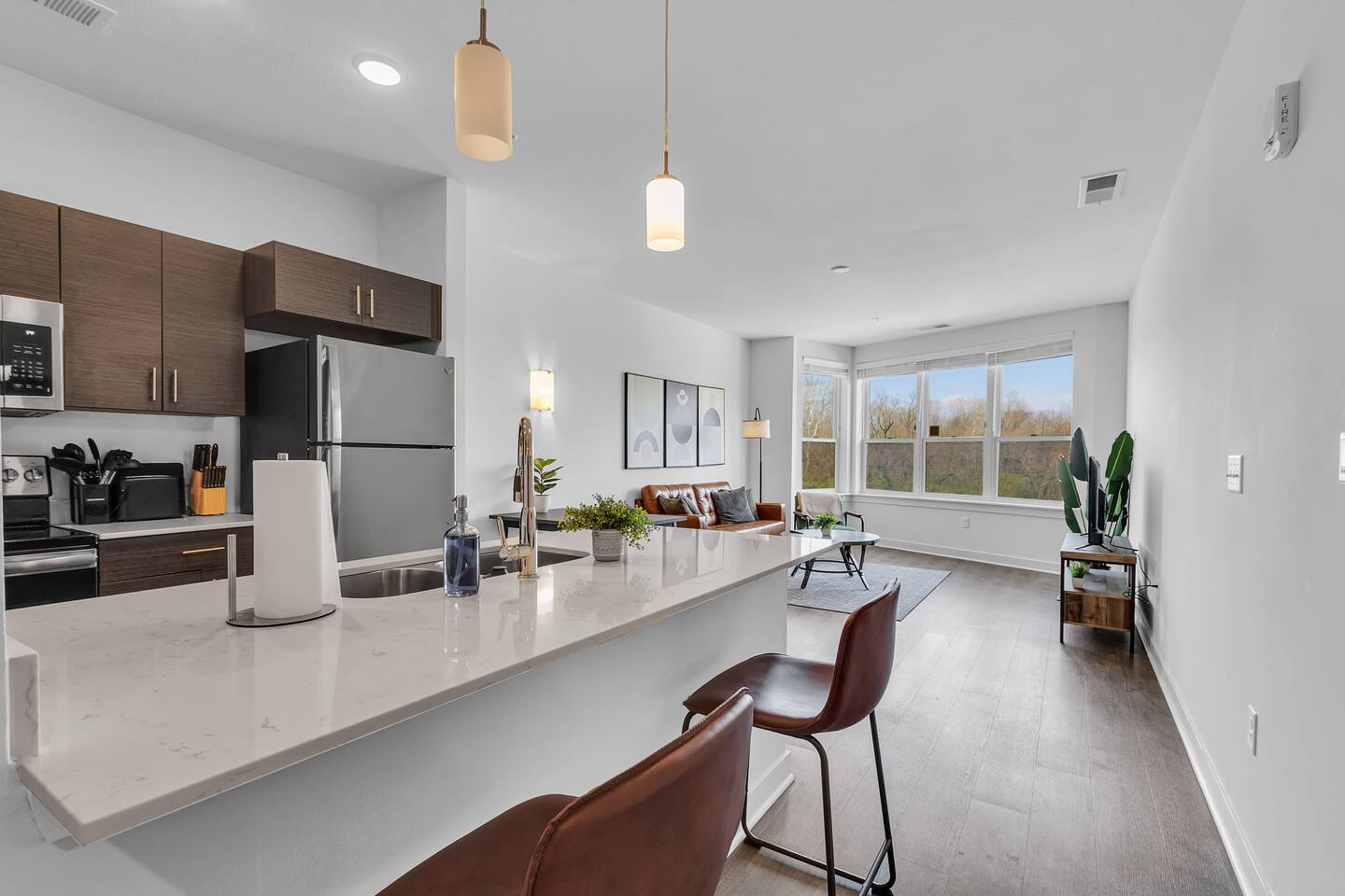 The apartments feature an open floor plan with a spacious living area, a kitchen equipped with high-quality appliances and fixtures, and a separate bedroom and half bathroom. The bedroom includes a walk in closet. The living room has a 40 inch TV.