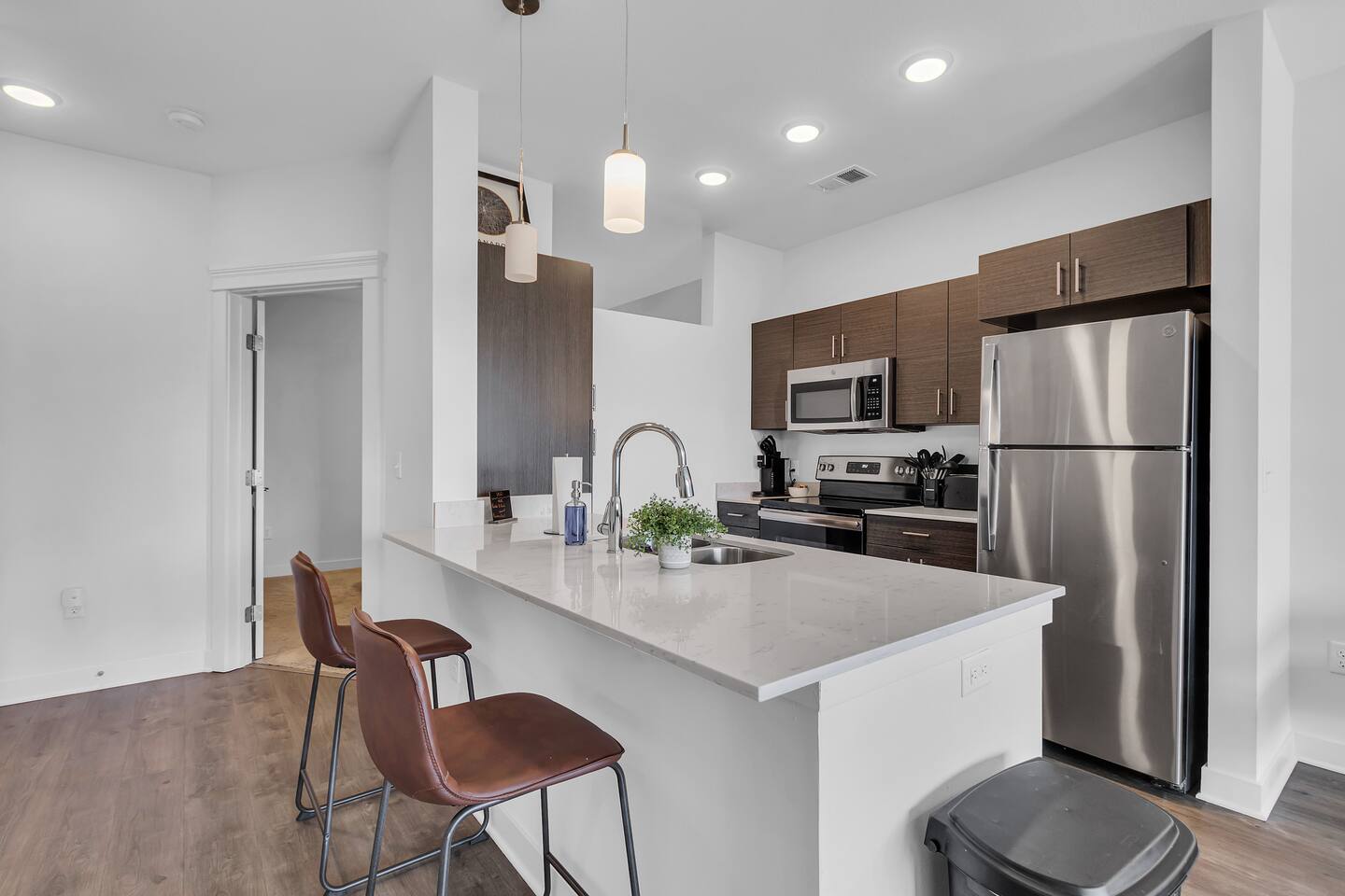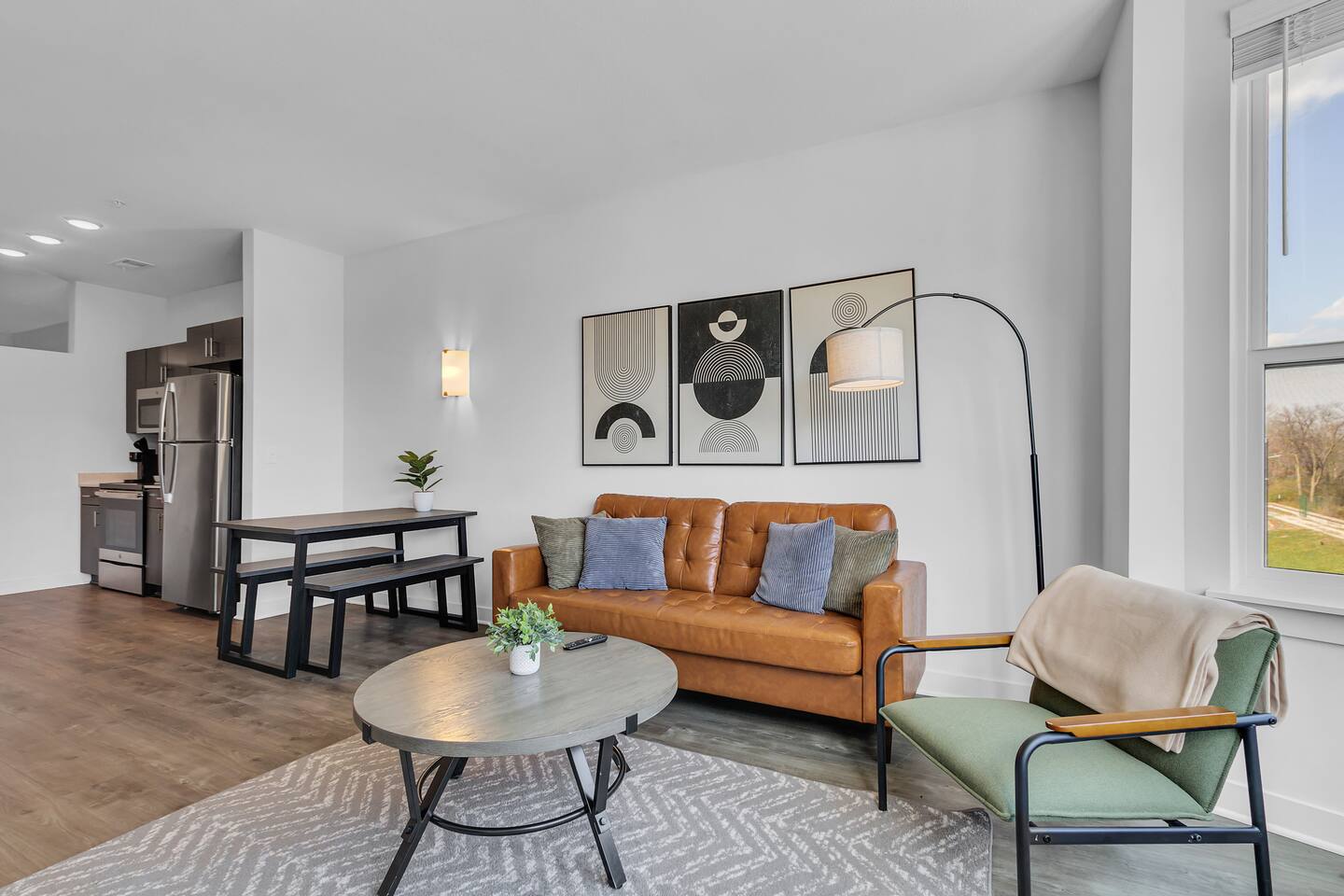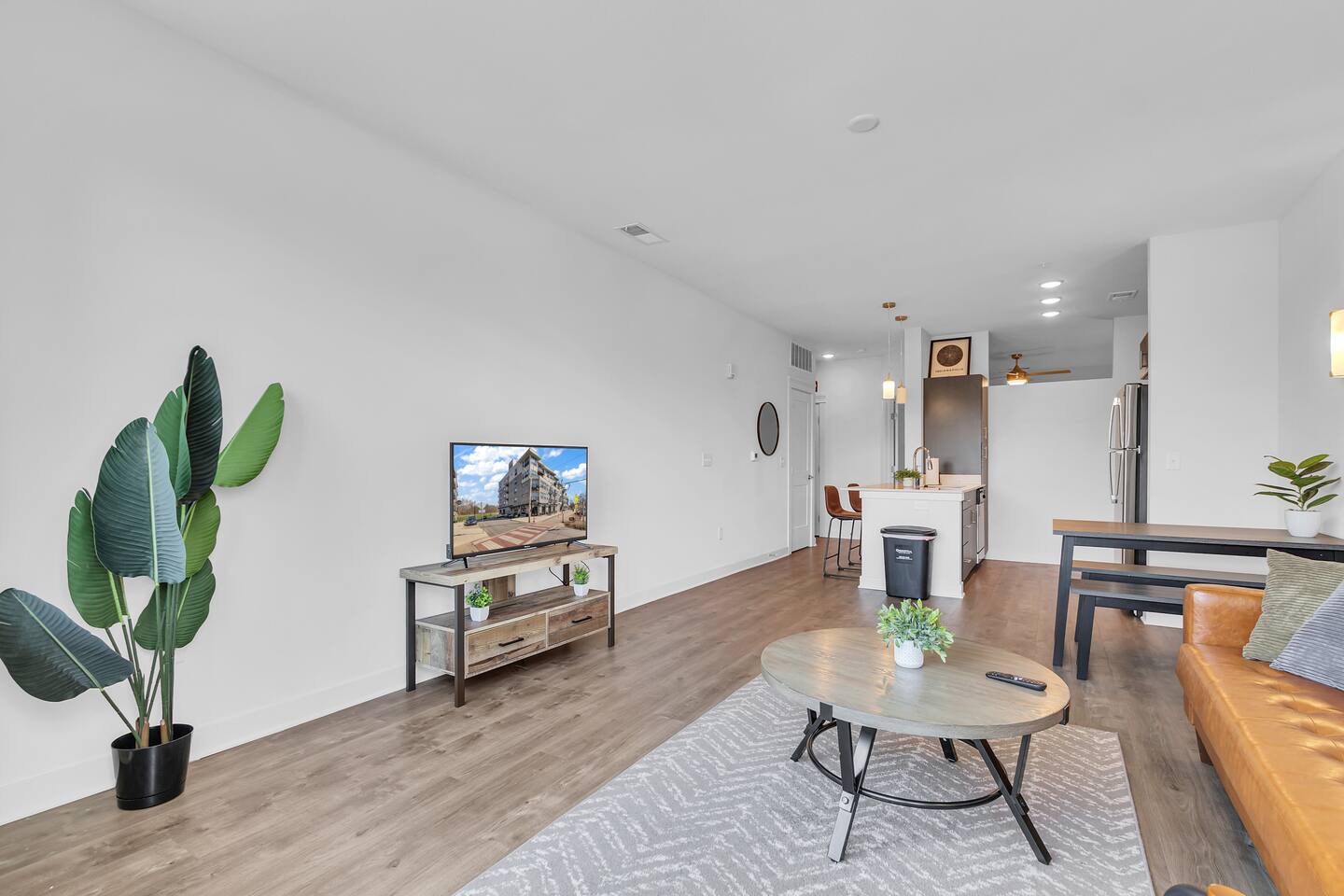 The apartments feature an open floor plan with a spacious living area, a kitchen equipped with high-quality appliances and fixtures, and a separate bedroom and half bathroom. The bedroom includes a walk in closet. The living room has a 40 inch TV.