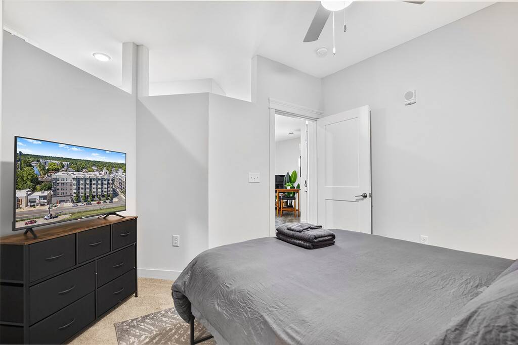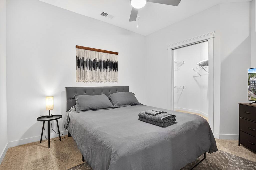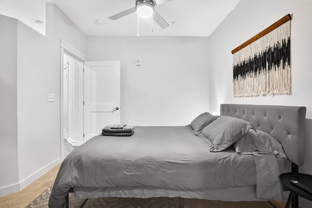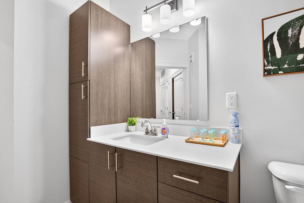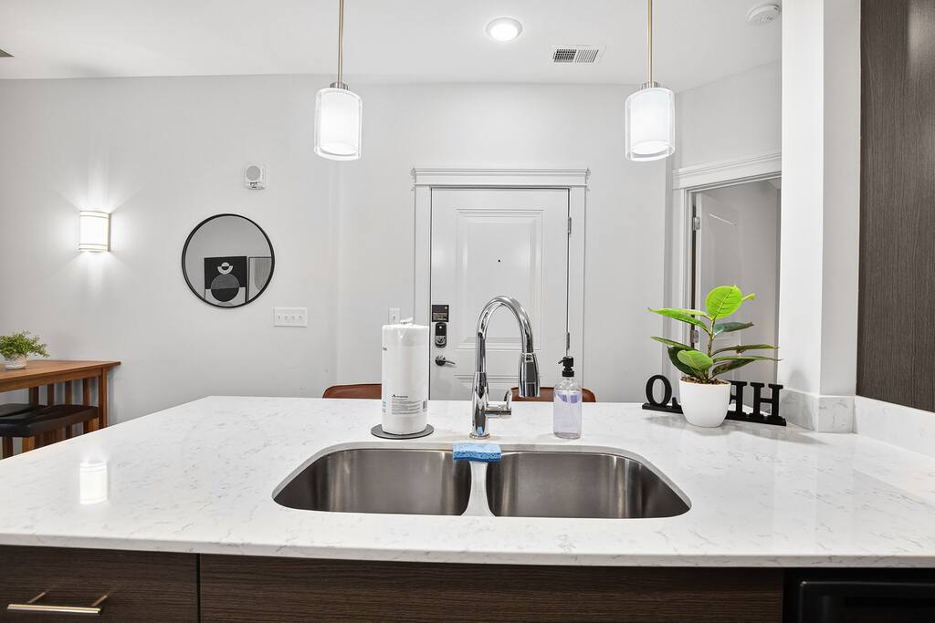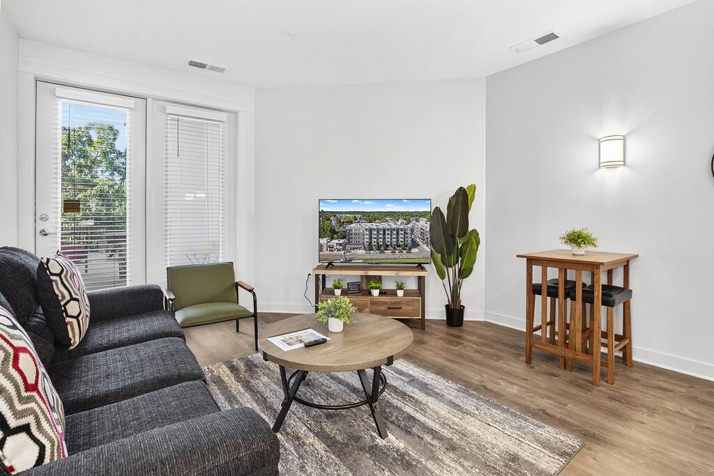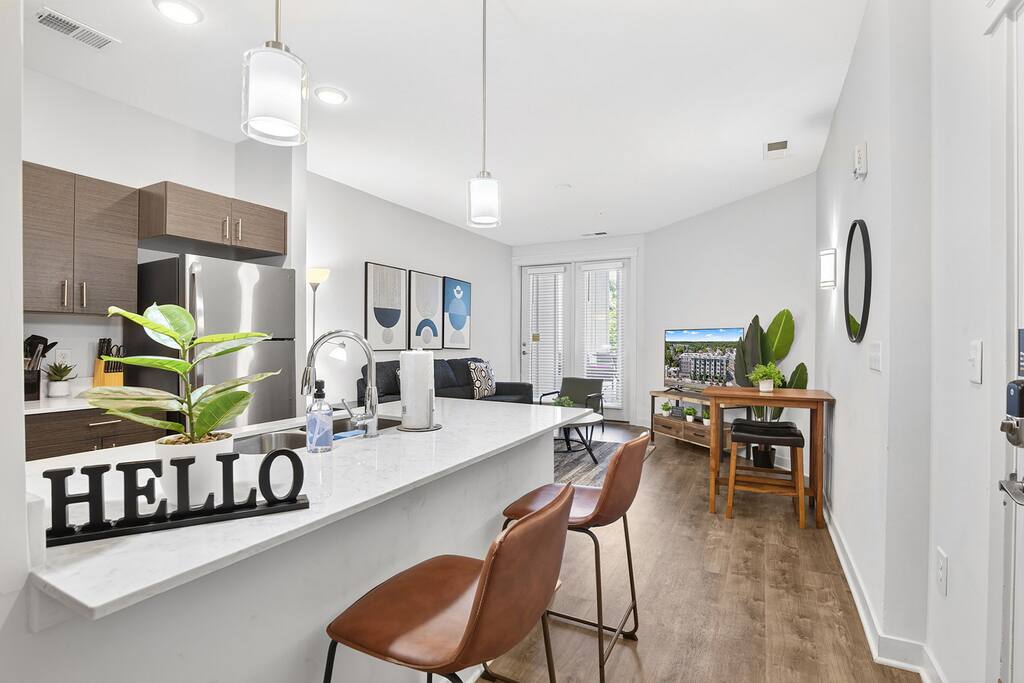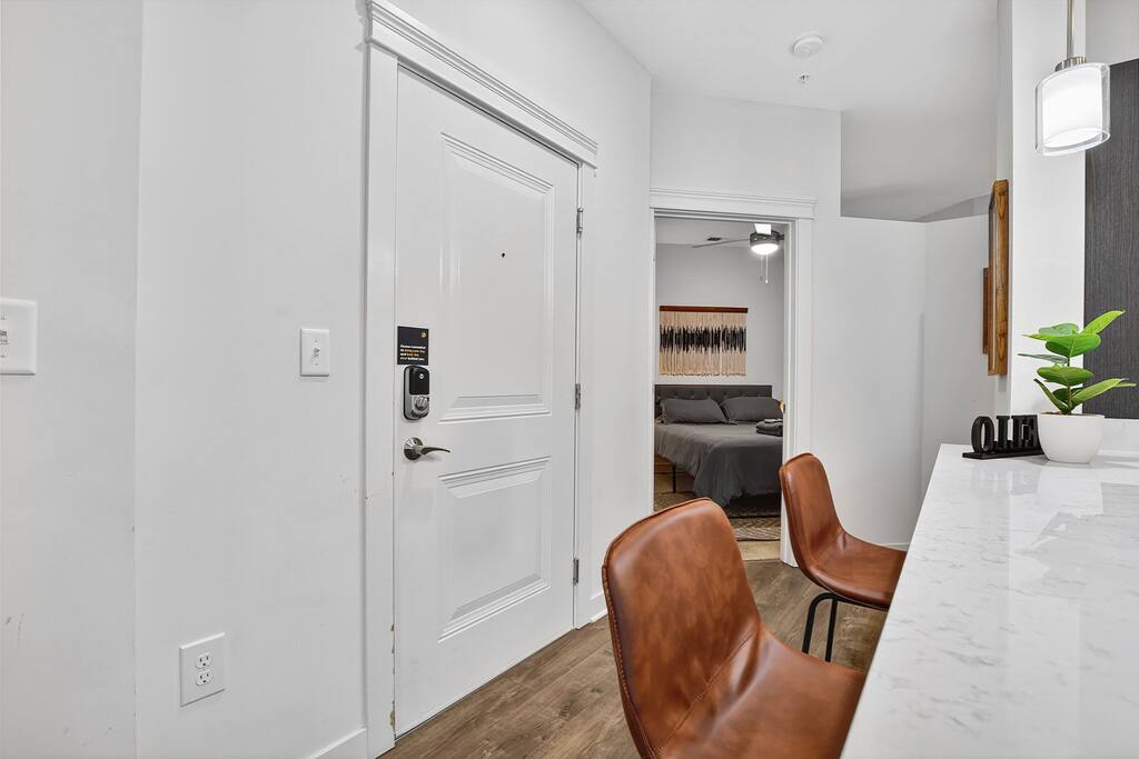 The apartments feature an open floor plan with a spacious living area, a kitchen equipped with high-quality appliances and fixtures, and a separate bedroom and half bathroom. The bedroom includes a walk in closet. The living room has a 40 inch TV. The elevator is under maintenance and may not available from 4/11/25-5/1/25.